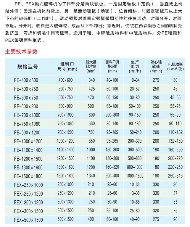 【產(chǎn)品簡(jiǎn)介】 PE型顎式破碎機(jī)是出現(xiàn)較早的破碎設(shè)備,因其構(gòu)造簡(jiǎn)單、堅(jiān)固、工作可靠、維護(hù)和檢修容易以及生產(chǎn)和建設(shè)費(fèi)用比較少,因此,直到現(xiàn)在仍然廣泛地在冶金、化工、建材、電力、交通等工業(yè)部門。(注:PE為粗顎式破碎機(jī),PEX為細(xì)顎式破碎機(jī)。)