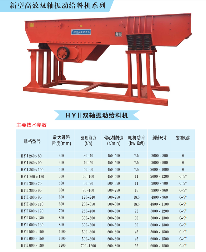規(guī)格型號(hào) | 進(jìn)料粒度(mm) | 處理能力(t/h) | 偏心軸轉(zhuǎn)速(r/min) | 電機(jī)功率(kw.6級(jí)) | 斜槽尺寸 | 安裝傾角 |