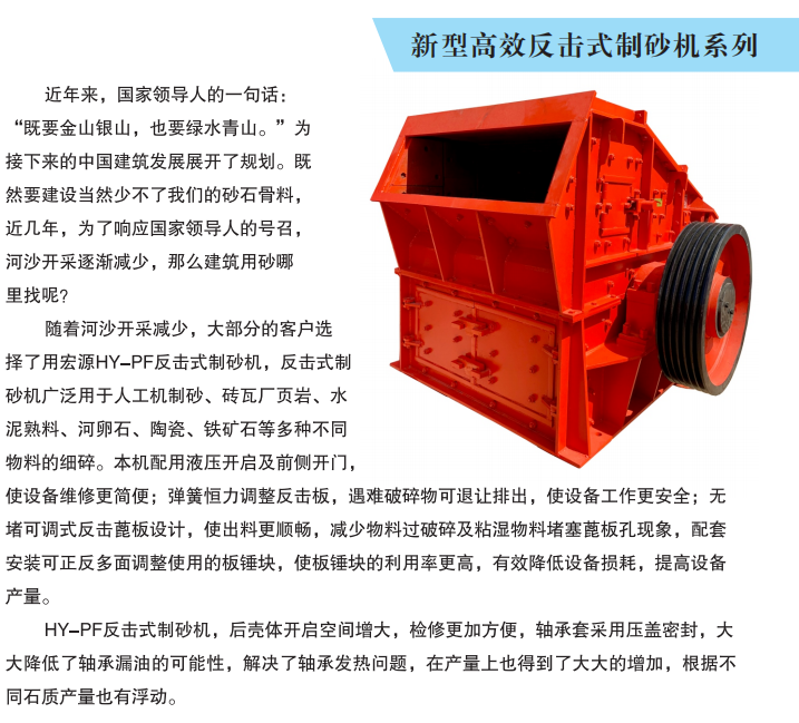 作為最先采用液壓啟動的新型反擊式制砂機設(shè)備,在節(jié)能上要比傳統(tǒng)制砂機省電50%。它可以把各種巖石、砂石,河卵石制成附和各種粒度的建筑用砂,砂質(zhì)粒度均勻、耐壓強度高,遠(yuǎn)比天然砂、普通錘式打砂機生產(chǎn)的砂更符合建筑要求,更能提高建筑質(zhì)量。